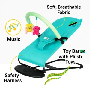 Kiti hiki cha hali ya juu ni mchanganyiko kamili wa usalama, faraja na burudani. Kimeundwa kurusha mtoto kwa upole huku kikicheza muziki wa kutuliza, hivyo husaidia kumtuliza, kumstarehesha na kusaidia ukuaji wenye afya. Kinafaa kwa watoto wachanga hadi umri wa miaka 2.